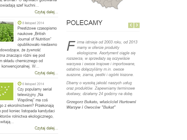 <p>[dropcap]<a href="index.php?option=com_sobipro&pid=61&sid=1107:bukat_hurtownia_warzyw_i_owoc_w&Itemid=1050" target="_self"><span style="color: #808080;">Firma istnieje od 2003 roku, od 2013 mamy w ofercie produkty ekologiczne. Asortyment ciągle się rozszerza, w sprzedaży są oczywiście warzywa i owoce krajowe i importowane, ostatnio dołączyliśmy m.in. owoce suszone, ziarna, pestki i ogórki kiszone. [/dropcap]</span></a></p>
